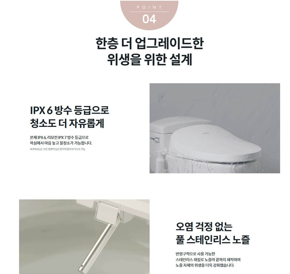 - 순간 온수: 찬물 걱정 없이 즉시 따뜻한 물로 세정 가능