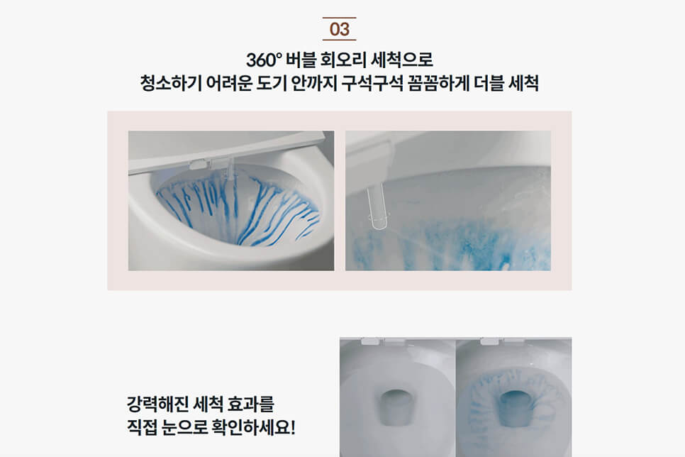 - 360˚ 버블 회오리 세척: 노즐과 도기를 구석구석 청소해 위생을 유지합니다.